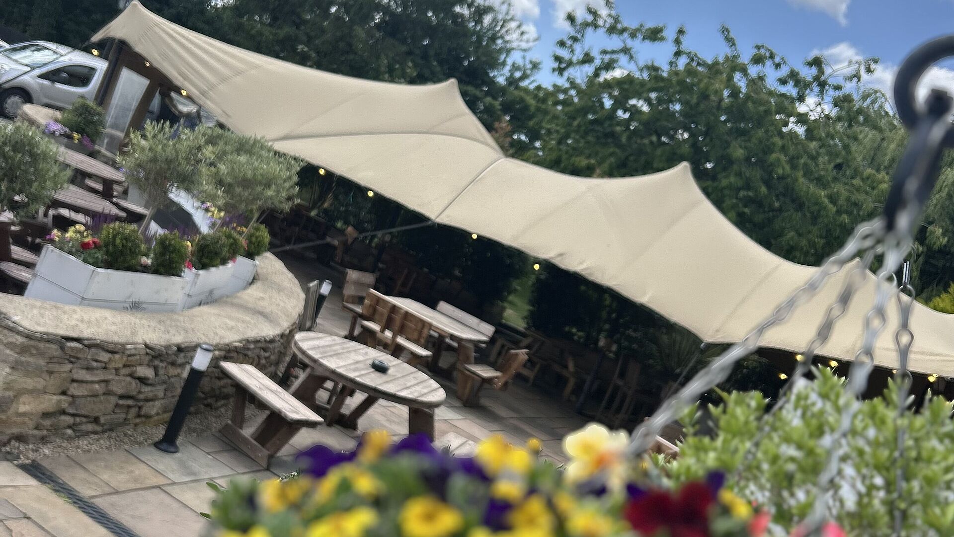 As a countryside pub, you’ll enjoy many traditional features when you visit us, such as Impressive traditional stone brickwork, views over fields and trees, and floral displays, including our beautiful hanging baskets.